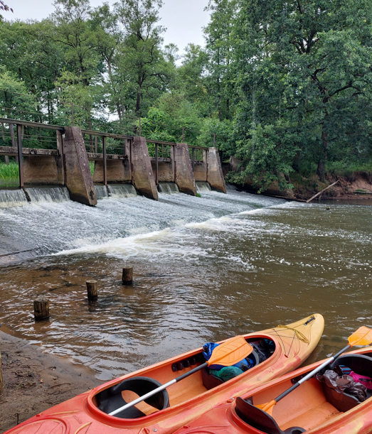 Po zwodowaniu się przy jedynym w Kielczy moście (z niebiesko białymi barierkami), płynąc dalej, po około 2 km, natkniemy się na pierwszą małą przeszkodę. Będzie to jaz na rzece i znajduje się dokładnie tutaj ⬅️ Kliknij by sprawdzić mapę. 🗺️