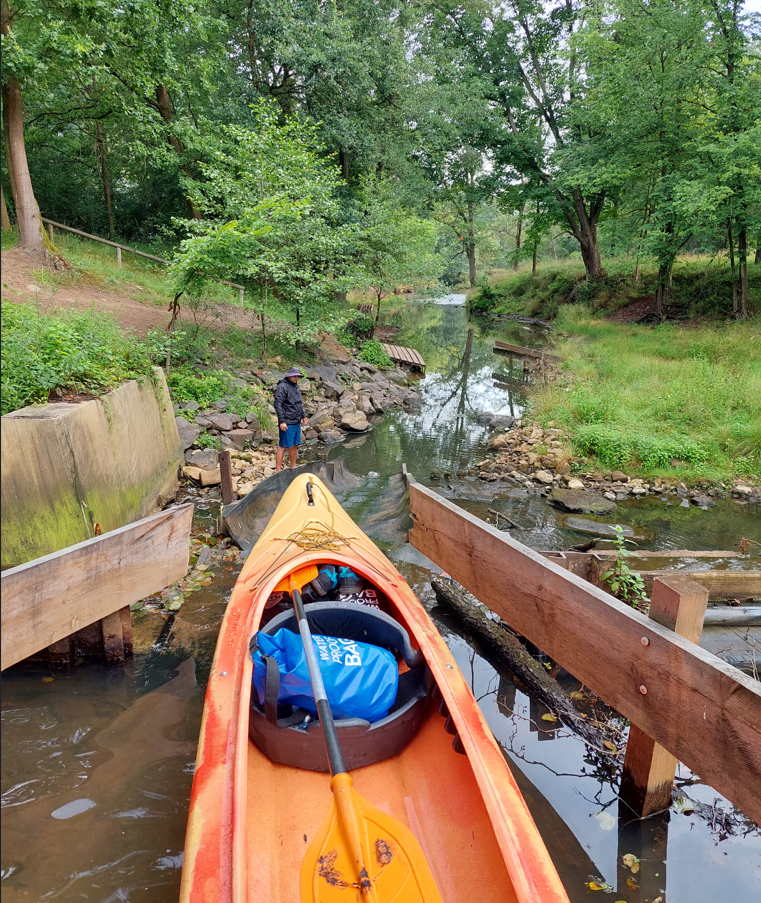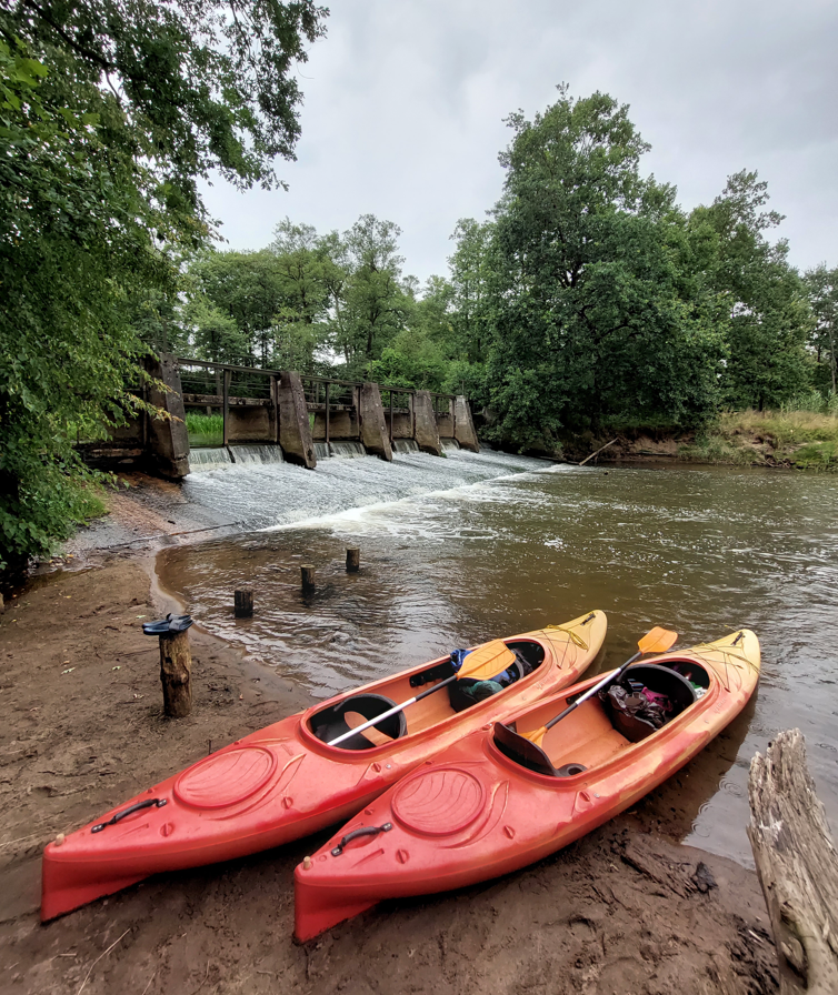 wariant nr 2 z lewej strony około 50 metrów, lub więcej, w zależności, gdzie uda się wyciągnąć kajak, a następnie spróbować spłynąć “młynówką” co może okazać się również uciążliwe. My osobiście zawsze decydujemy się na wariant nr 1.