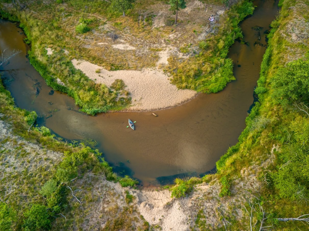 Rzeka płynie wśród lasów sosnowych i piaszczystych brzegów, które tworzą idealne miejsca na odpoczynek podczas spływu.